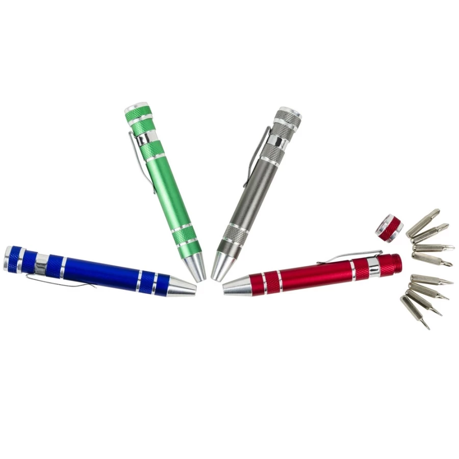 Tate skrūvgriezis ir mazs, bet daudzfunkcionāls sīkrīks, kas patiks ne tikai aizrautīgiem meistariem. Šis atjautīgais palīgs, kas ir glītas "pildspalvas" formā, slēpj līdz pat astoņiem maināmiem uzgaļiem - četrus plakanus un četrus Phillips -, kas atvieglo nelielu remontdarbu veikšanu mājās, birojā vai darbnīcā. Tas ir izgatavots no izturīga alumīnija, ir viegls, ērts un izskatās patiešām profesionāli. Ideāli piemērots kā praktiska reklāmas dāvana, kas nenonāks atvilktnē, bet gan... ikdienas lietošanai. Ar jūsu uzņēmuma logotipu uz futrāļa tas kļūst par funkcionālu zīmola nesēju - ideāli piemērots izstādēm, reklāmas pasākumiem vai kā dāvana klientiem.
